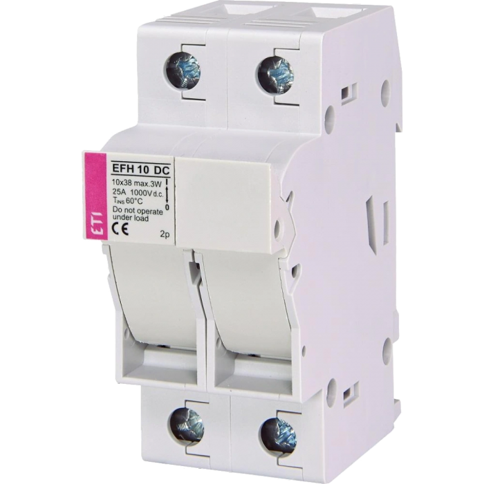 ● Типорозмір: 10x38;● Кількість полюсів: 2;● Спосіб монтажу: TH 35;● Категорія застосування: DC-20B;● Номінальний струм (A): 25A;● Номінальна напруга DC (В): 1000V;● Сумісність: CH gPV запобіжники;● Стандарт: IEC 60947-1,IEC 60947-3,UL 4248-1,UL 4248-19