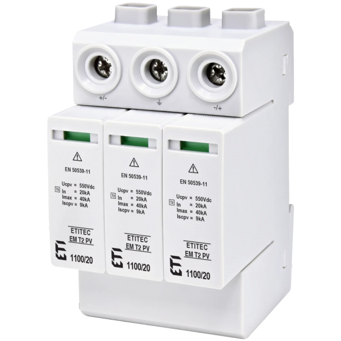 ● Тип струму: DC; ● Відповідність стандартам IEC VDE: II / C; ● Призначення: SPD; ● Кількість полюсів: 3;● Напруга довготривалої роботи Uc, (DC): 1100V;● Ступінь захисту: IP20; ● Рівень захисту по напрузі Up, (kV): 3.9;● Технологія: MOV; ● Maксимальний струм розряду In (8/20), (kA): 20