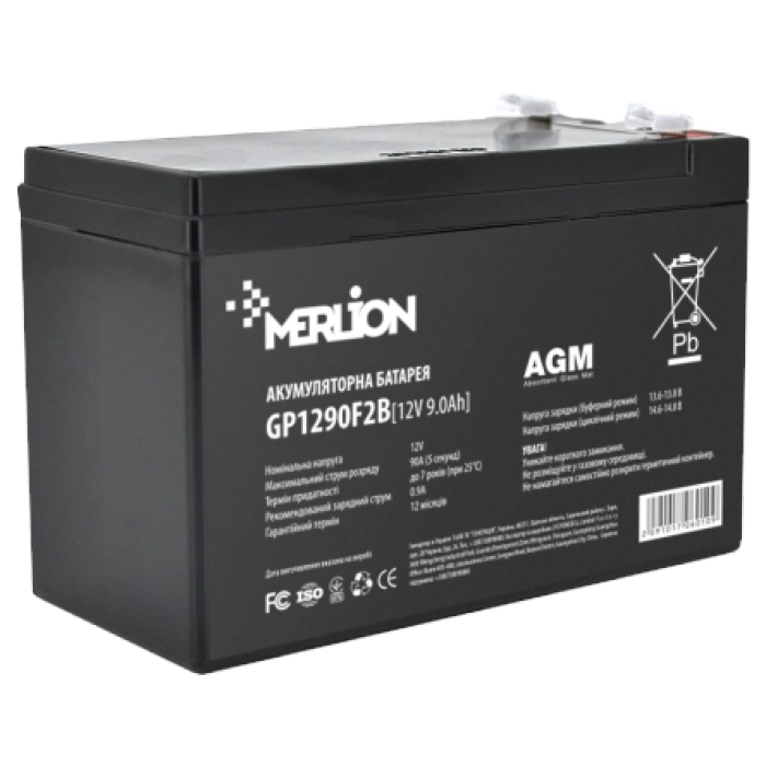 ● Напруга: 12 В;● Номінальна ємність: 9 A•год;● Внутрішній опір: 16 мОм;● Тип клем: F2;● Максимальний струм розряду: 134 А (5 секунд;)● Максимальний зарядний струм: 2.7 A;● 150 x 65 x 95;● 2,175 кг