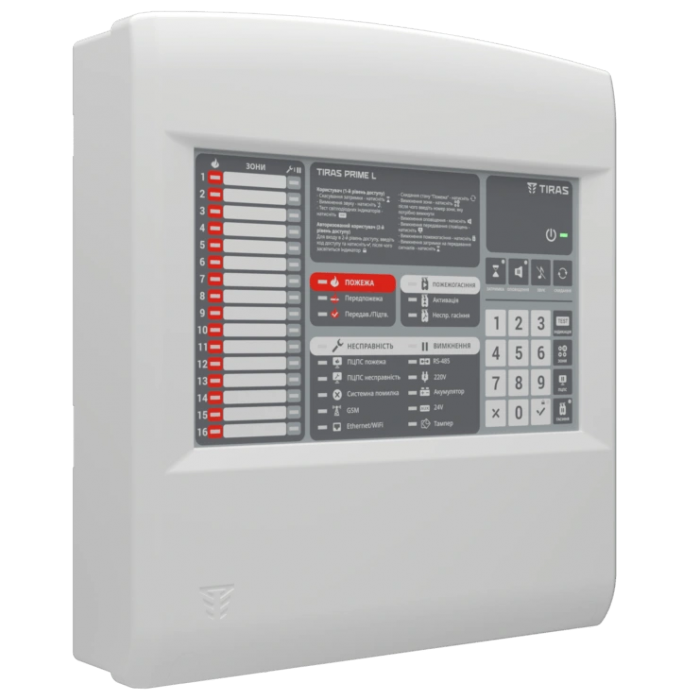 ● Базові зони: 16;● Сповіщувачів в зоні: 32;● Напруга в зоні: 24 В;● Виходи: "Пожежа", "Несправність", 2 релейні виходи для оповіщення чи контролю автоматики;● Інтрефейси: 2x RS-485 (довжина шини до 1000 м), USB-C, Ethernet;● Розширення (через RS-485): до 16 пристроїв загалом, до 8 M-OUT8R або M-OUT2R box, до 8 ПУІЗ Tiras 1X;● Основне живлення: 220 В;● Резервне живлення: АКБ 2x 7-8 А•год;● 280х280х80 мм