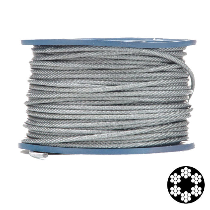 ● Діаметр 8 мм (6+2);● Паковання 100 м;● Розривне навантаження 1957 кг;● Покриття цинк білий, ПВХ оболонка;● Стандарт DIN 3055;● Конструкція 6х7 + FC;● Матеріал сталь