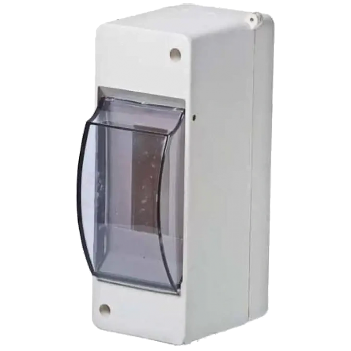 Корпус предназначен для монтажа 1 или 2 автоматических выключателей. Размещенная внутри DIN-рейка помогает организовать прочное крепление автоматов внутри бокса. Допустимая ширина выключателей – 1.8 см. Конструкция корпуса позволяет разместить несколько боксов в ряд. Способ монтажа – навесной. Кабели электричества подводятся через выламывающиеся отверстия в корпусе.