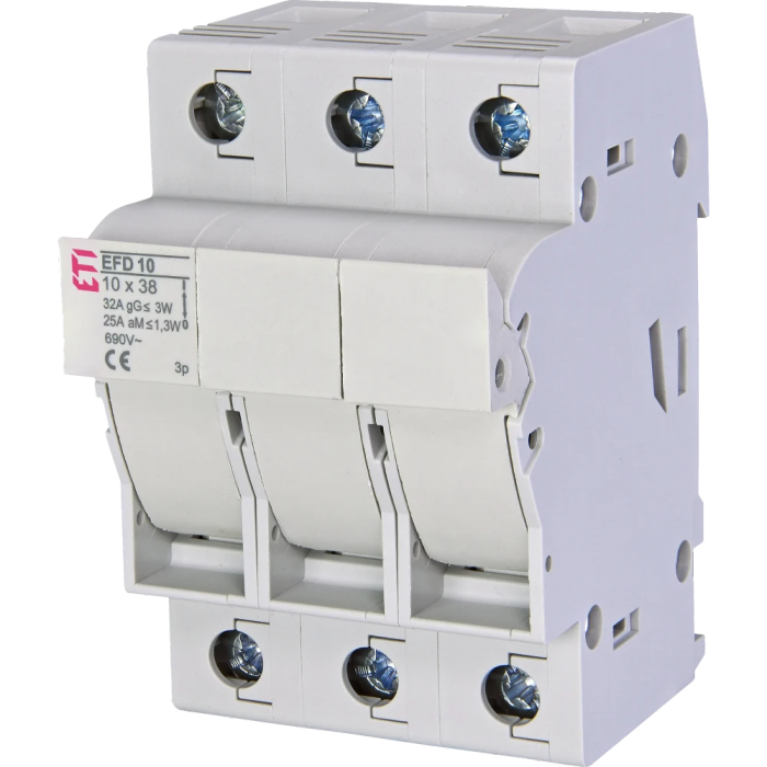● Типоразмер: 10x38;● Способ монтажа: TH 35;● Количество полюсов: 3;● Номинальное напряжение AC (В): 690V;● Категория применения: AC-22B;● Номинальный ток (A): 32A