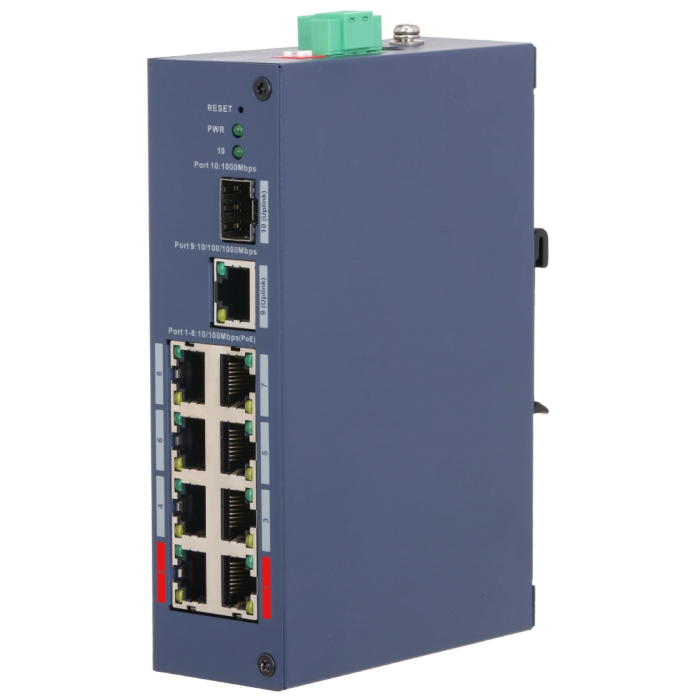 ● Downlink порти: 8x RJ45 (10/100M) з підтримкою PoE;● Uplink порти: 1 × RJ-45 10/100/1000M, 1 × SFP 1000M;● Протокол PoE: IEEE 802.3af; IEEE 802.3at; Hi-PoE; IEEE 802.3bt/бюджет 110 Вт;● Живлення: 48–57В DC, 2.5–2.1A;● Робоча температура: -30º - + 65ºC;● 154.4 × 110.4 × 42 мм
